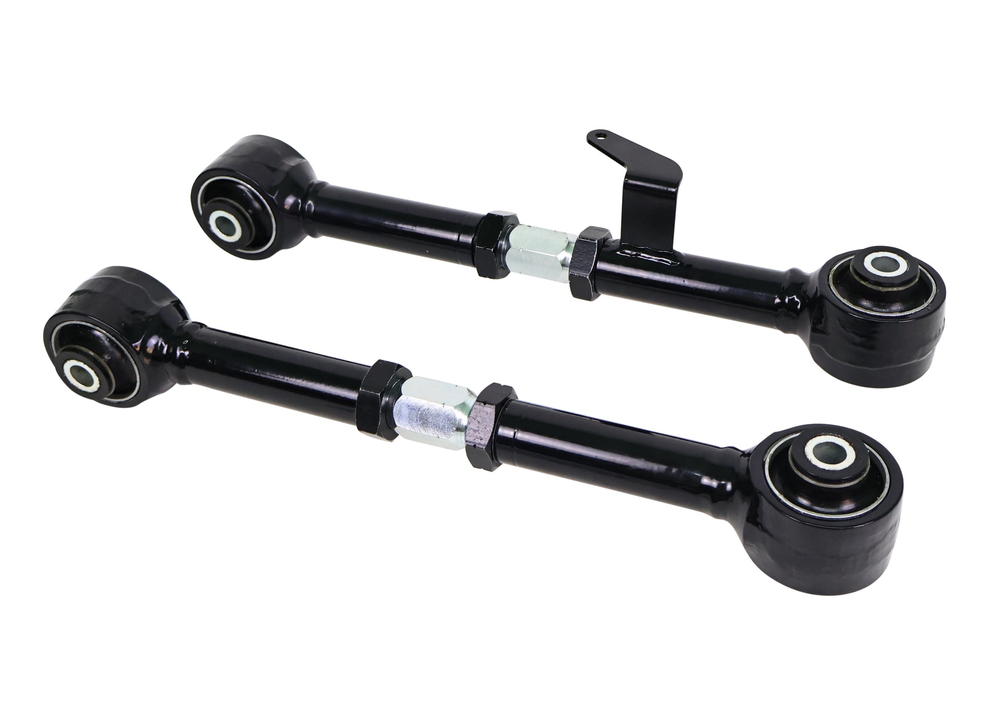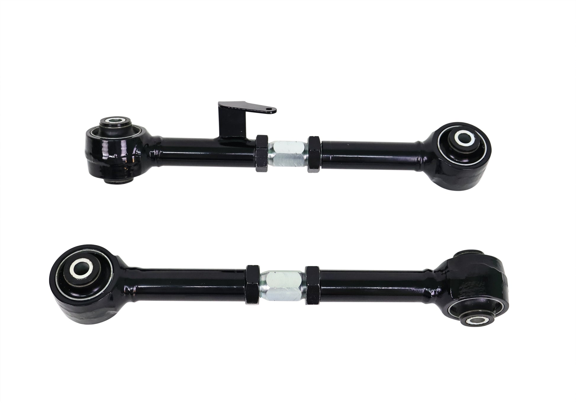 Heavy duty turnbuckle adjustable trailing arms provides incremental on car adjustability of differential pinion angle. This allows you to dial in more or less traction under heavy acceleration. Best matched with Whiteline's heavy duty upper trailing arms for optimum performance.