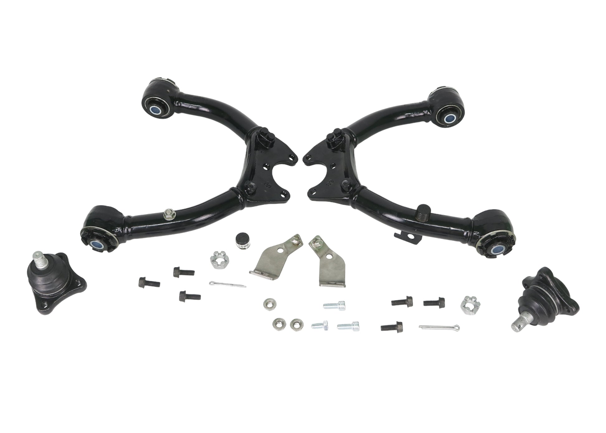 A short fall of the modern day IFS 4wd is the adjustment range provided for successful wheel alignments, this becomes even more of an issue when the vehicle is lifted by more than 1 inch. Not only does the vehicle run into camber and caster issues, but ball joint articulation and clearance issues to the coil over strut at ride and droop height. The new Whiteline offset UCA (Upper Control Arm) is an all-in-one solution for any vehicle that has been lifted between 30mm and 70mm. Providing an increase between +2.5 and +3.5 degrees of caster and up to 1.5 degrees of negative camber increase (figures quoted are based off an approximate 50mm/ 2 inch) along with greater clearance to the coil over strut and more articulation of the arm by virtue of new maintenance free GIIRO bushing technology.